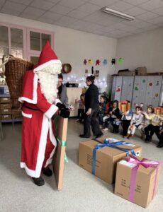 Enfin, le mois s’est achevé en beauté avec la visite du Père Noël. Il a offert à chaque élève une mandarine et des chocolats. Ainsi que de nouveaux équipements pour l’école : deux tables lumineuses et un trampoline.