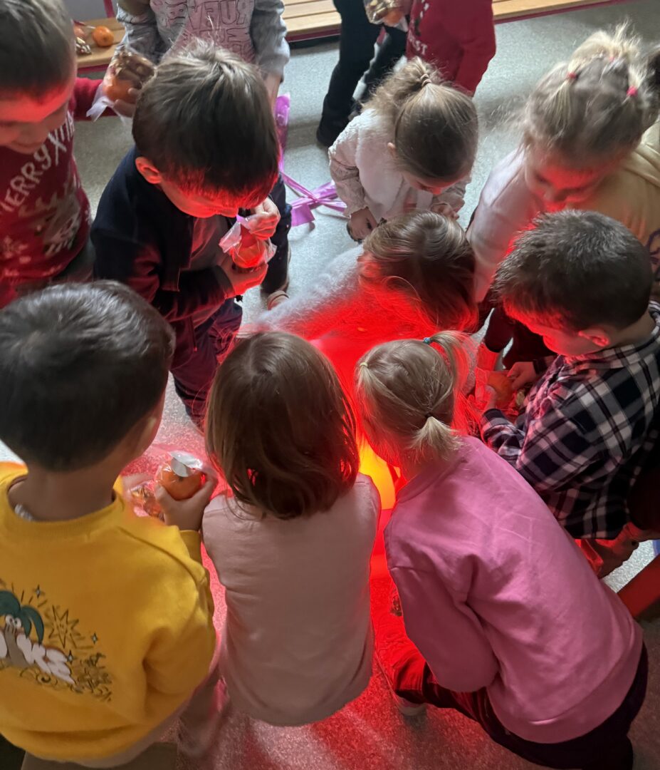 Enfin, le mois s’est achevé en beauté avec la visite du Père Noël. Il a offert à chaque élève une mandarine et des chocolats. Ainsi que de nouveaux équipements pour l’école : deux tables lumineuses et un trampoline.